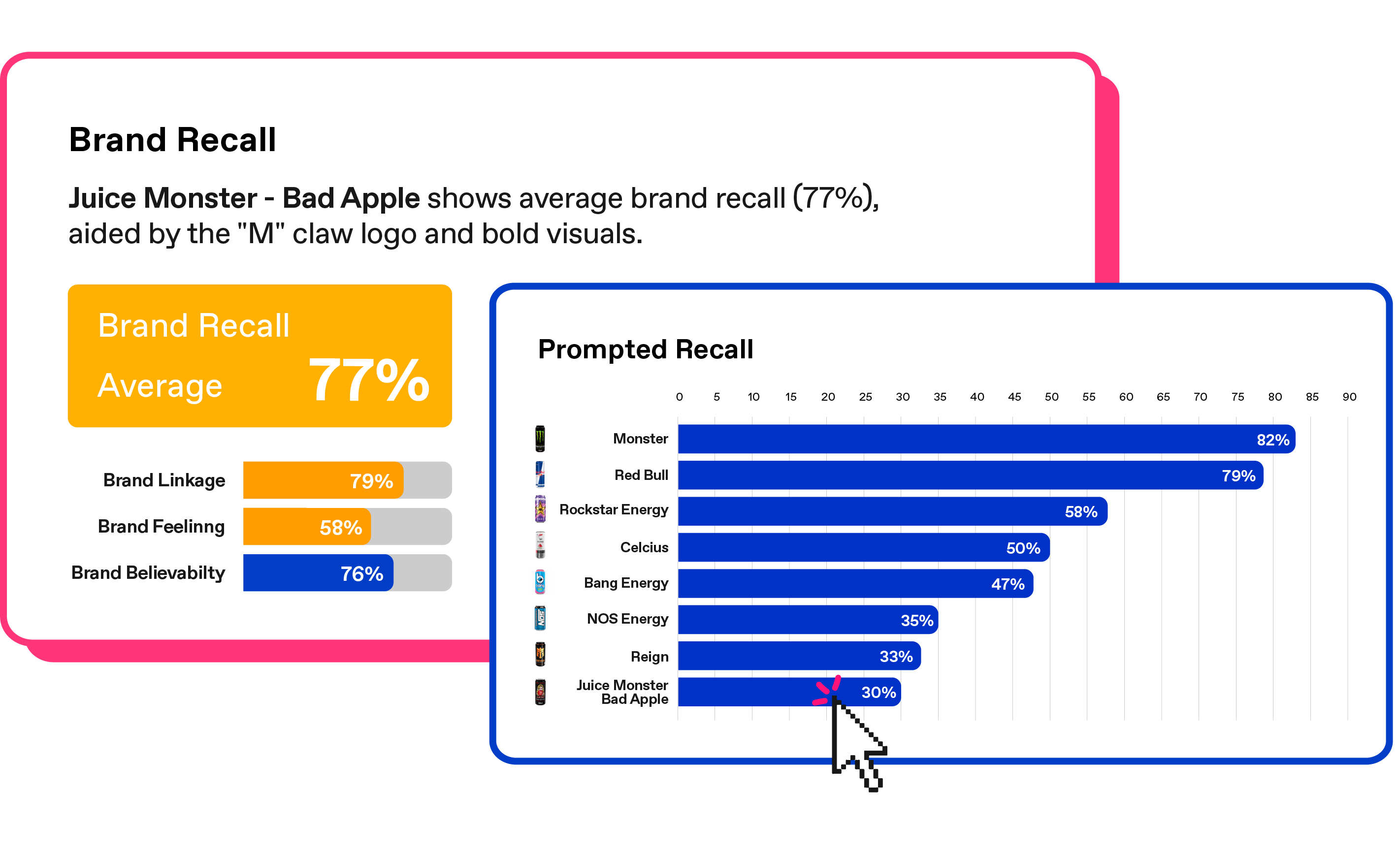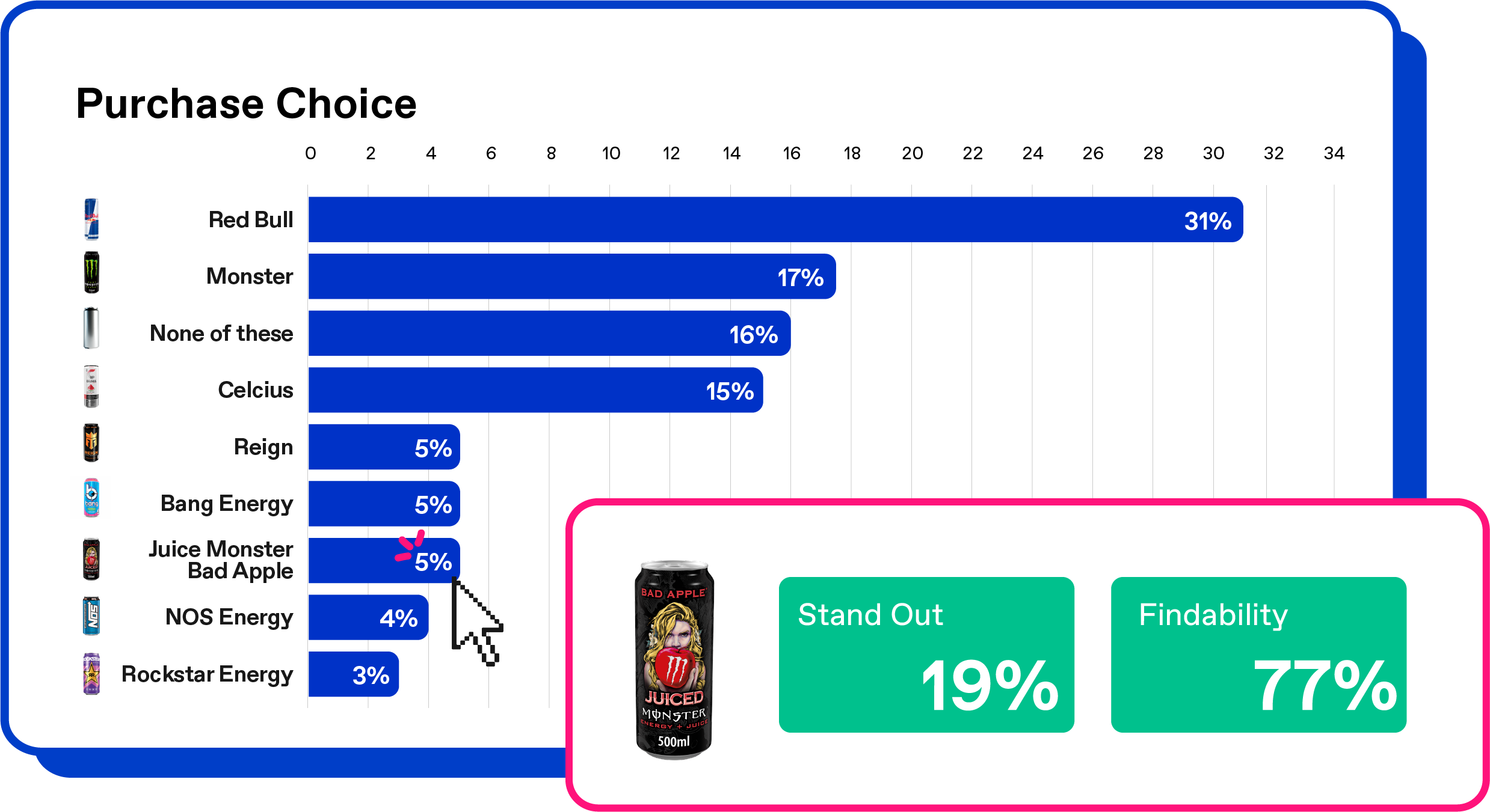 Our pack test evaluates your pack in the context of competitive products. Get an on-shelf read on stand out, findability, spontaneous and prompted brand recall, and reason for purchase choice — for both your pack and competitors.